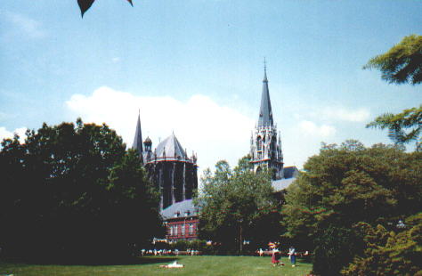 Aachen (Charlemane's city), Blue stain glass with dark reds and purples give the cathedral a great interior. This cathedral took 600 years to build. It fell down twice during construction because flying butresses had not yet been invented.